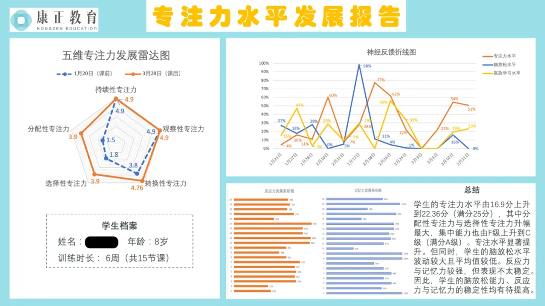 康正教育结合BrainCo头环,采用生物电反馈技术,实时检测孩子的专注力,并将其转换为具体分数,帮助老师、家长更直观得了解孩子的专注程度。筛查孩子专注力的薄弱维度,有针对性地设置训练方案,精准提升短板。