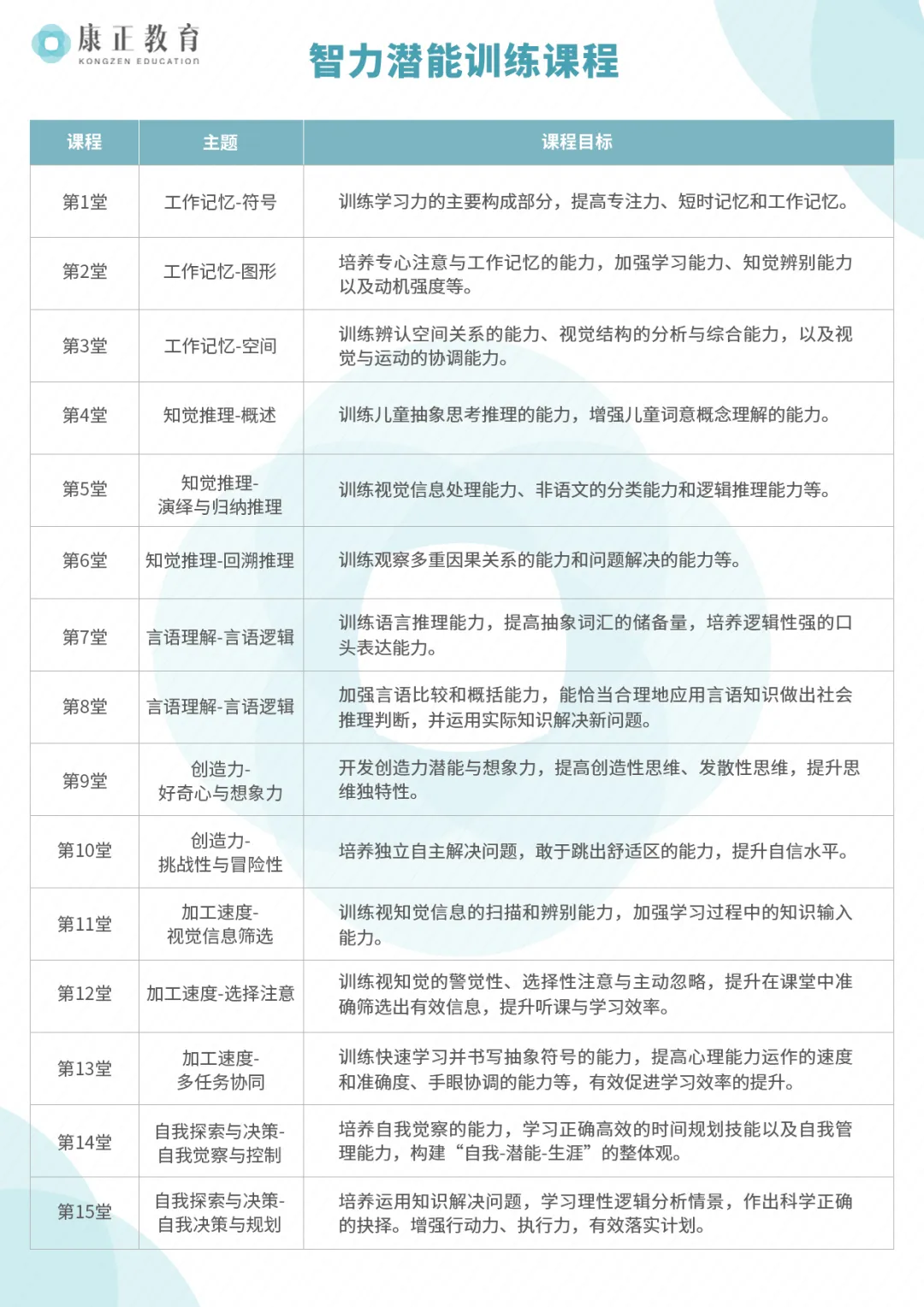 同时,康正教育创新性得将学习动机融入专注力提升课程,在提升孩子能力的同时,激发孩子的学习动机。学习能力与学习动机并驾齐驱,才能真正助力孩子的学习发展。